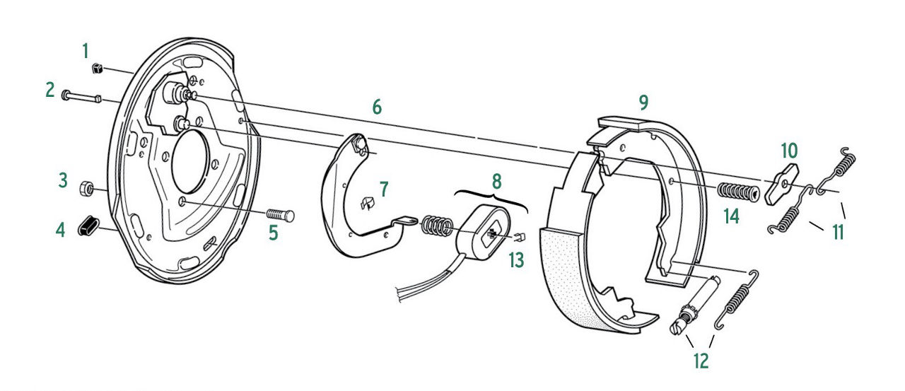 A: With the brake magnet at the bottom of the brake, the magnet actuating arm will curve either to the left (LH) or right (RH) from the top pivot point of the brake arm down to the magnet. If the arm curves to the left, it is a left-hand brake. If it curves to the right, it is a right-hand brake. In addition, the primary shoe is always to the front of the trailer and the brake wires always exit the rear of the brake backing plate.